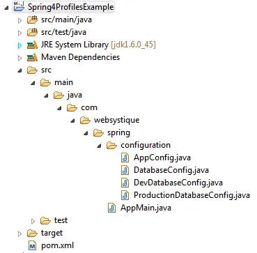 <?xml version="1.0" encoding="UTF-8"?> <beans xmlns="http://www.springframework.org/schema/beans" xmlns:xsi="http://www.w3.org/2001/XMLSchema-instance" xmlns:context="http://www.springframework.org/schema/context" xsi:schemaLocation="http://www.springframework.org/schema/beans http://www.springframework.org/schema/beans/spring-beans-4.0.xsd http://www.springframework.org/schema/context http://www.springframework.org/schema/context/spring-context-4.0.xsd"> <context:component-scan base-package="com.websystique.spring"/> <beans profile="Development"> <import resource="dev-config-context.xml"/> </beans> <beans profile="Production"> <import resource="prod-config-context.xml"/> </beans> </beans>