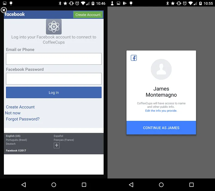 因为我们使用了原生脸书SDK,当用户登录就可以看到弹出原生 脸书登录,或者,如果他们已经安装了脸书应用程序,他们可以使用一个按钮点击立即登录应用: