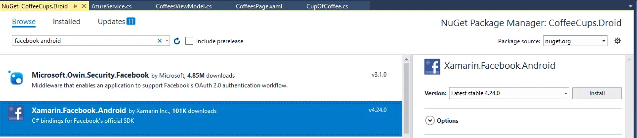 随着我们的脸书网应用程序的建立,我们现在可以开始集成脸谱网Android SDK,可以从NuGet安装到我们的应用。 这是由脸书网提供给Xamarin.Android绑定到离线离线SDK , which allows us to use all of the features available to Java and Kotlin developers.这使我们能够使用所有可用的java和Kotlin开发的特点。