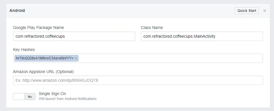 我们可以在脸书网开发者网站上添加安卓平台,这样脸书网就有了更多关于我们应用程序的信息。这就要求我们的包名、类名、密钥散列。