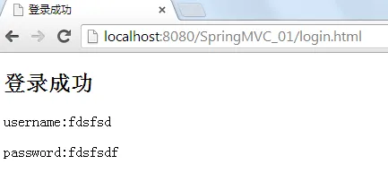 <%@ page language="java" contentType="text/html; charset=utf-8" pageEncoding="utf-8"%> <!DOCTYPE html PUBLIC "-//W3C//DTD HTML 4.01 Transitional//EN" "http://www.w3.org/TR/html4/loose.dtd"> <html> <head> <meta http-equiv="Content-Type" content="text/html; charset=utf-8"> <title>登录成功</title> </head> <body> <h2>登录成功</h2> username:${username } <p> password:${password } </body> </html>