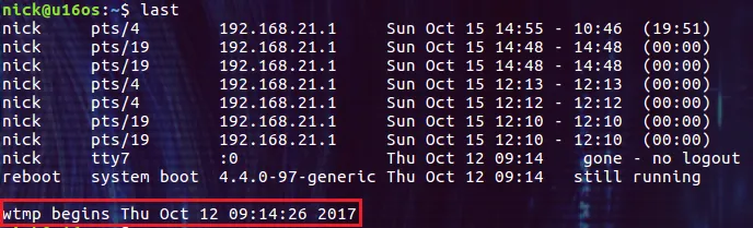 信息记录了谁在什么时间从哪里登录了服务器,登录了多长时间。需要注意的是系统中的 wtmp 日志文件经常会被轮转,所以有时你需要显式的指定 last 命令从哪个文件中读取信息: