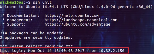 它会记录系统中所有用户最近一次登陆的信息。比如我们通过 ssh 登录时提示的此用户最后一次的登录时间,就是从这个文件中取出的:
