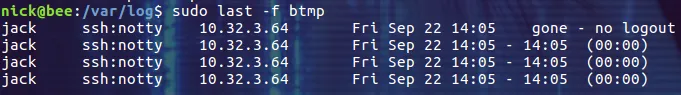 $ sudo last -f /var/log/btmp
