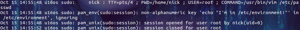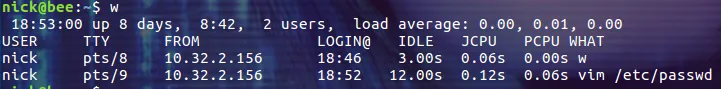 我们可以看到用户 nick 同时登录了两个终端,在其中一个终端中执行了 w 命令,而在另一个终端中正通过 vim 编辑 /etc/passwd 文件!