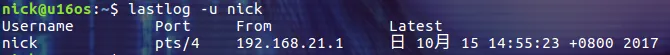图中显示的只是完整列表的一部分,**Never logged in** 表示该用户从来没有登陆过。如果要查看某个用户的最后登陆信息,可使用 -u 选项:
