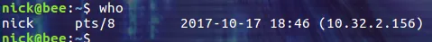 who 命令通过查询 /var/run/utmp 文件来显式系统中当前登录的每个用户。默认的输出包括用户名、终端类型、登录日期及远程主机: