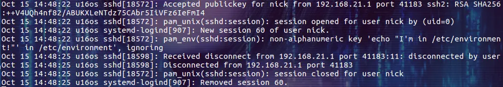 上图显示日志记录了通过秘钥认证的方式登录主机并退出的过程。