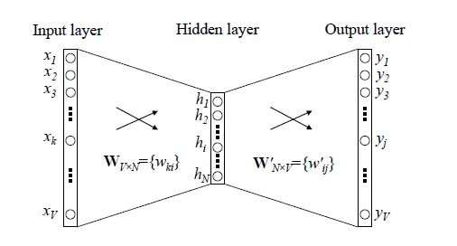 我们先回顾下传统的神经网络词向量语言模型,里面一般有三层,输入层(词向量),隐藏层和输出层(softmax层)。里面最大的问题在于从隐藏层到输出的softmax层的计算量很大,因为要计算所有词的softmax概率,再去找概率最大的值。这个模型如下图所示。其中 是词汇表的大小,