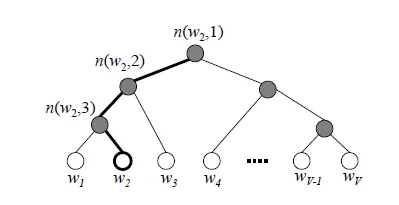由于我们把之前所有都要计算的从输出softmax层的概率计算变成了一颗二叉霍夫曼树,那么我们的softmax概率计算只需要沿着树形结构进行就可以了。如下图所示,我们可以沿着霍夫曼树从根节点一直走到我们的叶子节点的词 。