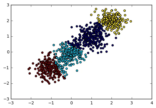 由于我们知道数据是4个簇随机产生的,因此我们可以通过输入可选的类别数4来看看BIRCH聚类的输出。代码如下: