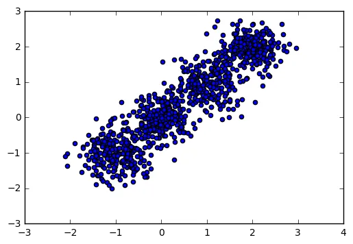 import numpy as np import matplotlib.pyplot as plt %matplotlib inline from sklearn.datasets.samples_generator import make_blobs # X为样本特征,Y为样本簇类别, 共1000个样本,每个样本2个特征,共4个簇,簇中心在[-1,-1], [0,0],[1,1], [2,2] X, y = make_blobs(n_samples=1000, n_features=2, centers=[[-1,-1], [0,0], [1,1], [2,2]], cluster_std=[0.4, 0.3, 0.4, 0.3], random_state =9) plt.scatter(X[:, 0], X[:, 1], marker='o') plt.show()