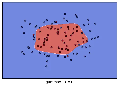 x_min, x_max = X[:, 0].min() - 1, X[:, 0].max() + 1 y_min, y_max = X[:, 1].min() - 1, X[:, 1].max() + 1 xx, yy = np.meshgrid(np.arange(x_min, x_max,0.02), np.arange(y_min, y_max, 0.02)) for i, C in enumerate((0.1, 1, 10)): for j, gamma in enumerate((1, 0.1, 0.01)): plt.subplot() clf = SVC(C=C, gamma=gamma) clf.fit(X,y) Z = clf.predict(np.c_[xx.ravel(), yy.ravel()]) # Put the result into a color plot Z = Z.reshape(xx.shape) plt.contourf(xx, yy, Z, cmap=plt.cm.coolwarm, alpha=0.8) # Plot also the training points plt.scatter(X[:, 0], X[:, 1], c=y, cmap=plt.cm.coolwarm) plt.xlim(xx.min(), xx.max()) plt.ylim(yy.min(), yy.max()) plt.xticks(()) plt.yticks(()) plt.xlabel(" gamma=" + str(gamma) + " C=" + str(C)) plt.show()