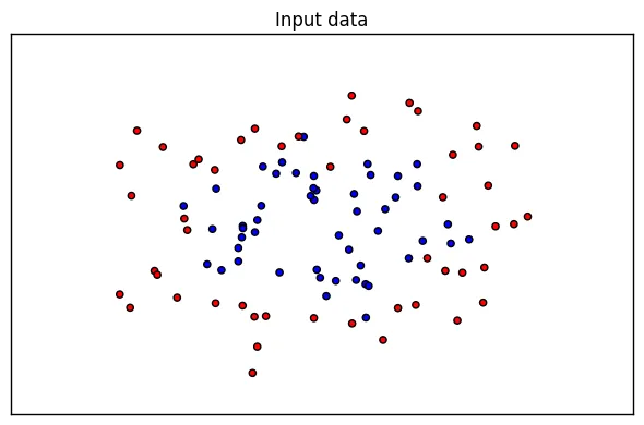 from matplotlib.colors import ListedColormap cm = plt.cm.RdBu cm_bright = ListedColormap(['#FF0000', '#0000FF']) ax = plt.subplot() ax.set_title("Input data") # Plot the training points ax.scatter(X[:, 0], X[:, 1], c=y, cmap=cm_bright) ax.set_xticks(()) ax.set_yticks(()) plt.tight_layout() plt.show()