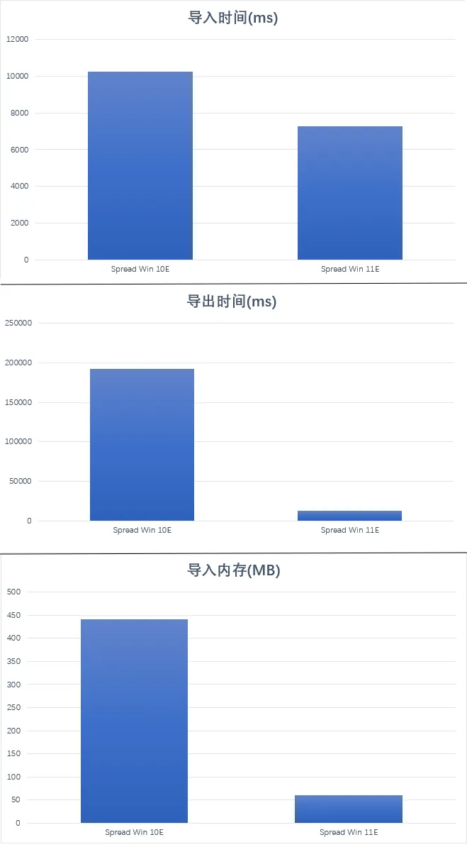 Spread 在进行大数据量的导入导出时,时间消耗大量减少,同时内存消耗急剧下降,这也表明 Spread Studio V11 CTP 版本的性能得到了巨大的提升。