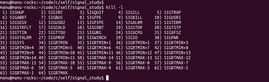 - manu@manu-hacks:~/code/c/self/signal$ ./signal_receiver:PID is 23416