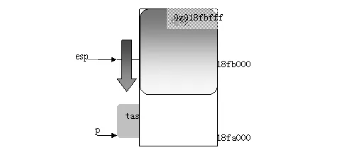 在Intel系统中,栈起始于末端,并朝这个内存区开始的方向增长。从用户态刚切换到内核态以后,进程的内核栈总是空的,因此,esp寄存器直接指向这个内存区的顶端。 在图4.2中,从用户态切换到内核态后,esp寄存器包含的地址为0x018fc00。进程描述符存放在从0x015fa00开始的地址。只要把数据写进栈中,esp的值就递减。