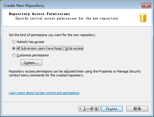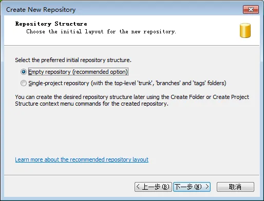 创建空的资源库,或者创建带有trunk braches tags目录的资源库。一般自己使用的话,第一个就可以了。