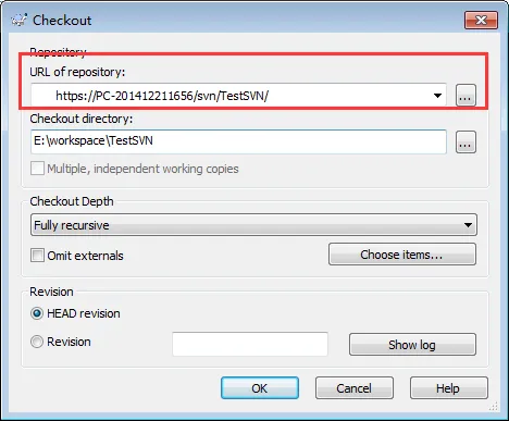 填写资源库URL,以及本地代码文件夹名称。可以选择全部检出,或者根据特定的版本号检出。