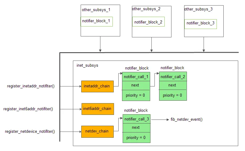 inet_subsys是通过notifier_call_chain来通知其他的子系统(other_subsys_x)的。