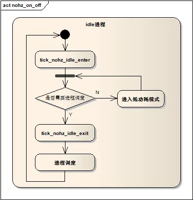 开启动态时钟模式后,周期时钟的开启和关闭由idle进程控制,idle进程内最终是一个循环,循环的一开始通过tick_nohz_idle_enter检测是否允许关闭周期时钟若干时间,然后进入低功耗的idle模式,当有中断事件使得cpu退出低功耗idle模式后,判断是否有新的进程被激活从而需要重新调度,如果需要则通过tick_nohz_idle_exit重新启用周期时钟,然后重新进行进程调度,等待下一次idle的发生,我们可以用下图来表示: