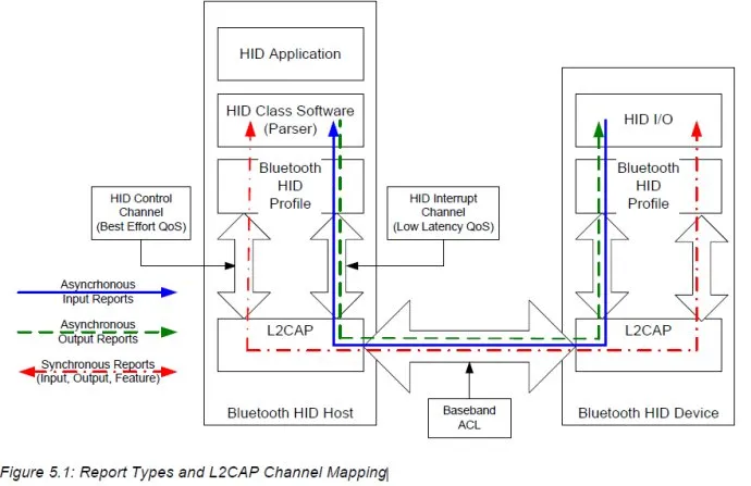 (2)HID建立Control Channel和Interrupt Channel两个通道,report可以在这两条channel上传输,在Control channel上传输的report称为synchronous reports ;在Interrupt channel上传输的report称为asynchronous reports。