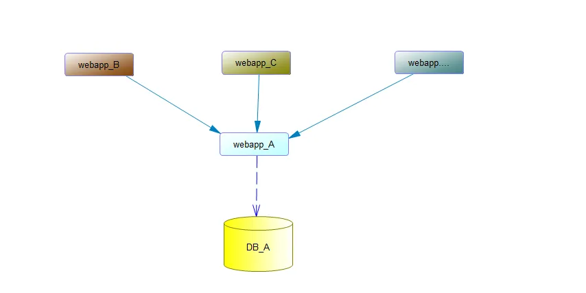 想从 DB_A 数据库获取数据的 web 服务越来越多,项目之间的关系逐渐演变为下面这样: