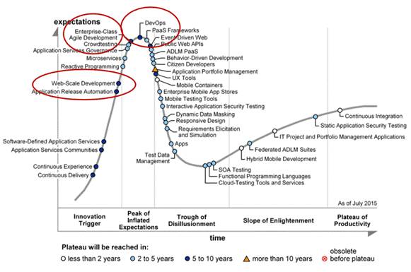 2009 年 6 月份,John Allspaw 及 Paul Hammond 在速度大会 (Velocity) 上分享了在 Flickr 中如何通过加强 Dev(开发团队)和 Ops(运维团队)之间的协作,从而加快应用部署频率的演讲 。随后,关于 Dev 和 Ops 之间协作的讨论一直在 Twitter 上持续进行,当年的 10 月份,在 Twitter 上首次出现了 DevOps( 开发运维一体化 ) 一词 。在随后的几年里,DevOps 不仅引起了工程界的大量关注和实践,同时,也吸引了大量学术界人士的兴趣。Gartner 2015 年所做的调查结果表明,目前已有 29% 的企业在使用 DevOps。图一所示为 Gartner 对各 IT 技术发展热度预测的研究,根据其研究,目前 DevOps 正处于其发展阶段的高潮期。