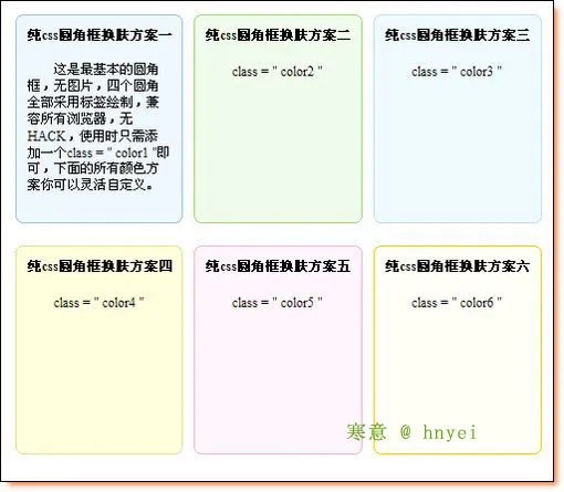 好了,我们将上面的所有代码集中起来,就完成一个纯CSS圆角框的实例模型,在源码中,我设置了六套颜色方案,其它的颜色方案就看你的了。