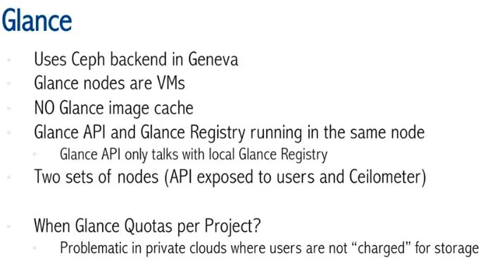 Glance 服务运行在虚机中。之前,Glance registry 可以被别的 Glance API 使用,但是,这导致难于定位问题,因此,现在的 Glance registry 只和本地的 Glance API 通信。但是,Glance 不支持分 Project 设置 Quota,这对他们很重要。