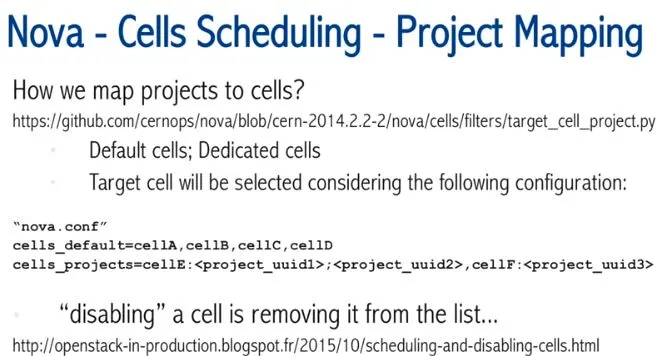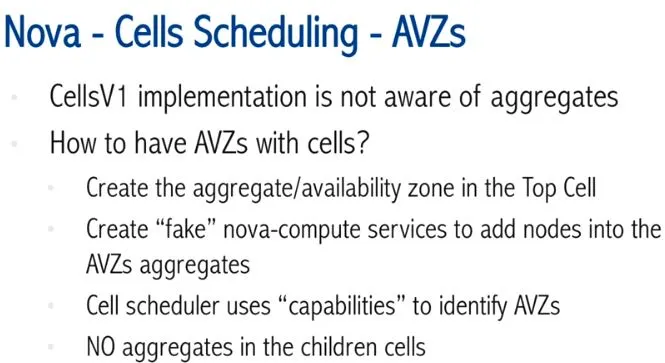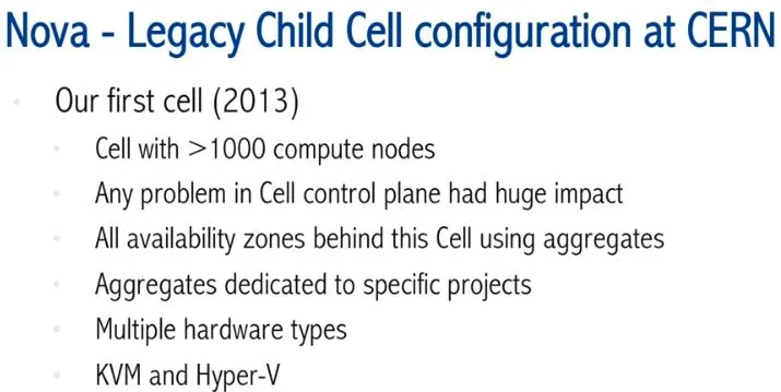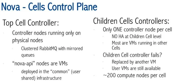 - 在 2013 年的时候,只使用了一个 Cell,考虑到:(1)Nova Cell 的调度机制非常弱,只能随机调度,(2)想使用 host aggregate功能 (3)不能跨Cell 做 live migration。但是最后发现非常难于管理。