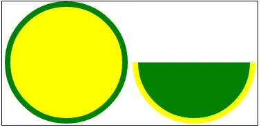 ctx.beginPath(); ctx.fillStyle="yellow"; ctx.strokeStyle="green"; ctx.lineWidth = "8"; ctx.arc(100, 175, 85, 0, 2*Math.PI); ctx.fill(); ctx.stroke(); ctx.beginPath(); ctx.fillStyle = "green"; ctx.strokeStyle = "yellow"; ctx.lineWidth = "8"; ctx.arc(285, 175, 85, 0, 1 * Math.PI); ctx.fill(); ctx.stroke();
