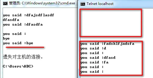 但是有一个问题...如果再开一个telnet访问的话输入什么都是没有效果的...只有等到第一个结束之后才会对第二个访问的telnet进行回复,如下图.