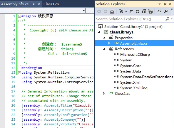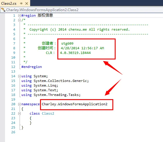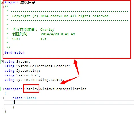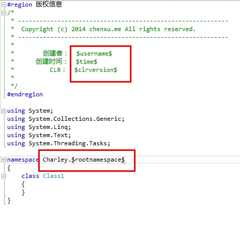 1 #region 版权信息 2 /* 3 * ----------------------------------------------------------- 4 * Copyright (c) 2014 chenxu.me All rights reserved. 5 * ----------------------------------------------------------- 6 * 7 * 创建者: $username$ 8 * 创建时间: $time$ 9 * CLR: $clrversion$ 10 * 11 */ 12 #endregion 13 14 using System; 15 using System.Collections.Generic; 16 using System.Linq; 17 using System.Text; 18 using System.Threading.Tasks; 19 20 namespace Charley.$rootnamespace$ 21 { 22 class Class1 23 { 24 } 25 }