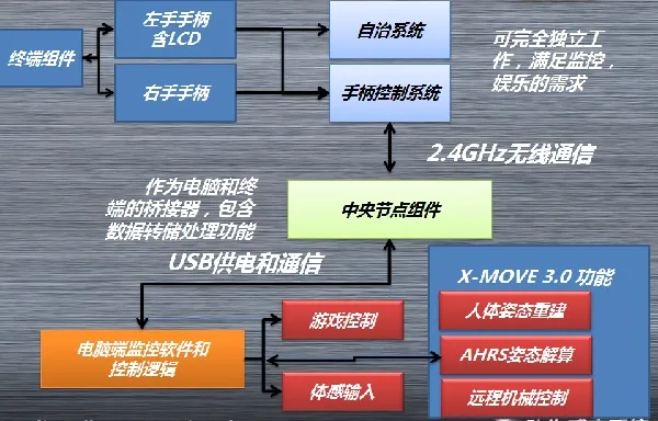 下图表示了2.0版本的主要设计思路和架构,它对1.0系统做了整体的改性,表现在传感器的升级和扩展性能的提升。它已经不限于简单的应用场景,比如游戏和简单的人机交互。我把它的目标定位继续扩展到全身人体监测,虚拟现实和机械控制领域。当然,全身人体监测在4.0以后才实现。
