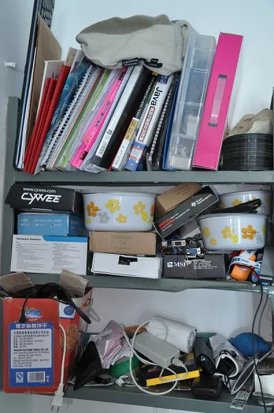 下面这张图是床的另外一侧,上面所有的盒子都装着电路板,ARM,MSP430,AVR,51...各种无线模块液晶屏键盘传感器,我床底下还有个大箱子,各种电阻电容:最上方的架子,塑料盒子里装着的就是XMOVE1.0的全套设备,看着真是太山寨了!!