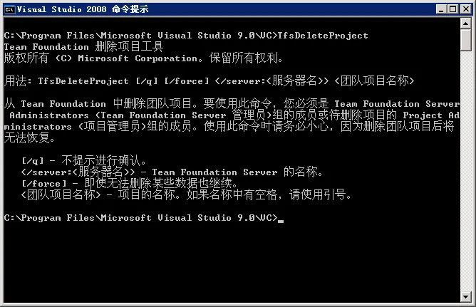 从团队资源管理界面上找不到删除团队项目的功能, 只能使用命令行工具 TfsDeleteProject ,打开Visual Studio 2008 命令行提示,输入TfsDeleteProject, 如下图所示.