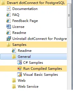 安装文件名是 dcpostgresqlfree.exe,版本是 5.30.160,安装的时候会选择是否将程序集编译到GAC中。安装完成以后在安装目录会有几个简单的示例程序解决方案: