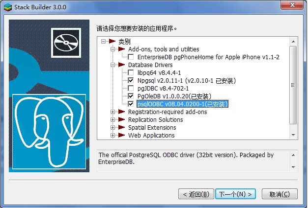 在Datase Drivers选项中,这里选择Npgsql v2.0.11-1,其它驱动程序根据需要安装。选择好以后,按照提示一步步即可完整安装好.NET的数据驱动程序。