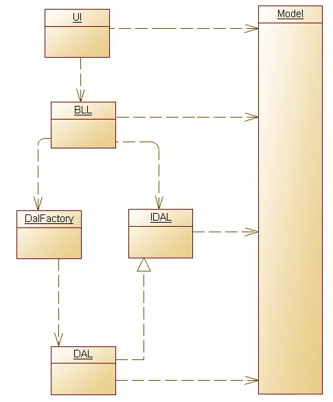 为了支持多数据库应用,在DAL中,定义了DAL Interface和DAL Factory,下面这个图也许跟简单直观一些(引用Do you know, jack? 园友http://www.cnblogs.com/zq8024/archive/2011/03/31/2001436.html 中的图片,请见谅:))