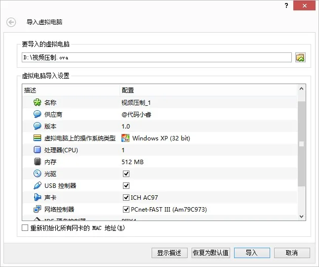 这里可以看到一些配置信息,双击都是可以进行修改的,其中@代码小睿就是我啦。可以修改的主要就是cpu和内存,因为压制的速度和这个有关,默认是单核,如果自己电脑是双核或者四核的cpu,可以修改为2,内存也可以改为1G或者2G。而默认的设置压制一部20分钟美剧,压制时间在15-20分钟,也算可以接受,搞不明白这些的就直接点“导入”就行。