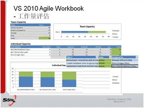 在Visual Studio 2010中提供了一个叫Agile Workbook的Excel模板,可以帮助我们很好地完成Sprint Planning Meeting。在这个会议中,最重要的任务就是将PBI转化成SBI,并且由团队给出完成这些SBI的承诺;团队要做出这样的承诺最重要的依据就是这些需求所涉及的工作量是否可以承受。Agile Workbook正是帮助我们回答这一问题的强大工具。从下图我们可以看到,当我们制定了迭代上的人员配备并将Task分配给每个开发人员以后,模板会给出非常直观的柱状图,帮助团队判断工作量是否可行。