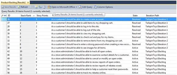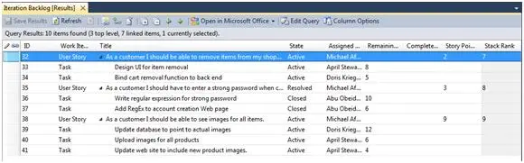 另外,从State和Iteration Path两个列的值我们可以看到,已经有一些需求在迭代1-2中已经解决。根据这些信息,PO可以很容易的对工作进度和剩余需求进行管理。