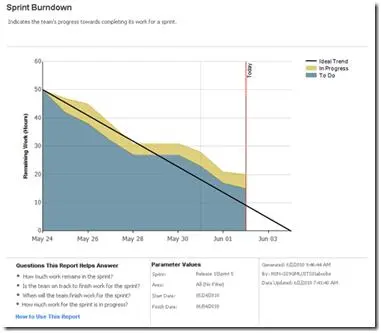 这个会议非常简短,所以我们更加需要非常直观的图表以帮助团队对进度进行审核,在TFS中提供了燃尽图为团队提供这些信息。