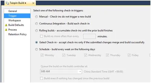Gated Check-in 触发方式和以往的触发方式所不同之处在于,开发人员执行迁入操作的时候代码并不会直接进入源代码库,而必须先经过构建的验证:保证编译成功和定义好的迁入验证测试可以成功运行,然后TFS才会把代码真正嵌入服务器。之前的持续集成(Continuous Integration) 方式也会在迁入的时候进行构建,但是这种构建是将代码先迁入,然后再运行构建,如果代码中已经存在了缺陷,那么在服务器上就会留下缺陷代码;Gated Check-in 借助TFS源代码管理中的“搁置”功能,先把代码搁置到服务器上临时存储中,在构建成功后才会正式迁入,所以缺陷代码不会进入服务器。