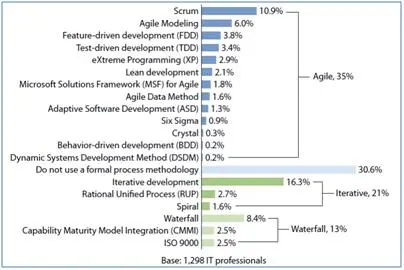根据Forrester Research今年第二季度的一份研究报告,在超过1000名专业开发人员中,采用敏捷模式进行软件开发的已经有10.9%采用了Scrum模式,在所有的敏捷开发模式中名列首位,而在所有的软件项目管理模式中,敏捷模式更是被35%的开发人员所采用。当然,研究报告为我们呈现的仅仅是一个统计学的观点,到底你的开发团队应该采用什么样的开发模式,这还是要根据各自不同的开发环境,人员构成,公司架构以及文化背景来决定。