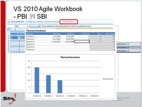 Scrum模式中的需求主要是采用Product Backlog Item(PBI产品需求列表)和Sprint Backlog Item (SBI 迭代需求列表)来进行管理的,在Visual Studio 2010系统中,直接提供了针对这两个列表的工作项查询,并且还提供了Agile Workbook (敏捷工作簿)帮助我们更好对工作量和任务分配进行调控。