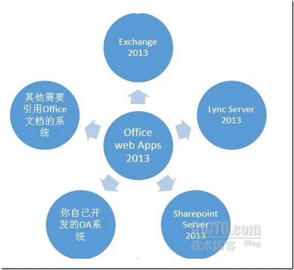 一般情况下,Office Web Apps要与其他应用配合使用,如下图所示(看起来还是很复杂的,这些东西好像也要独立安装在不同的机器):