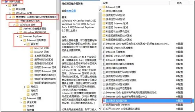 5.在【计算机配置】-【管理模板】-【windows组件】-【Internet Explorer】-Internet控制面板-安全页中。然后选择站点到区域分配列表。