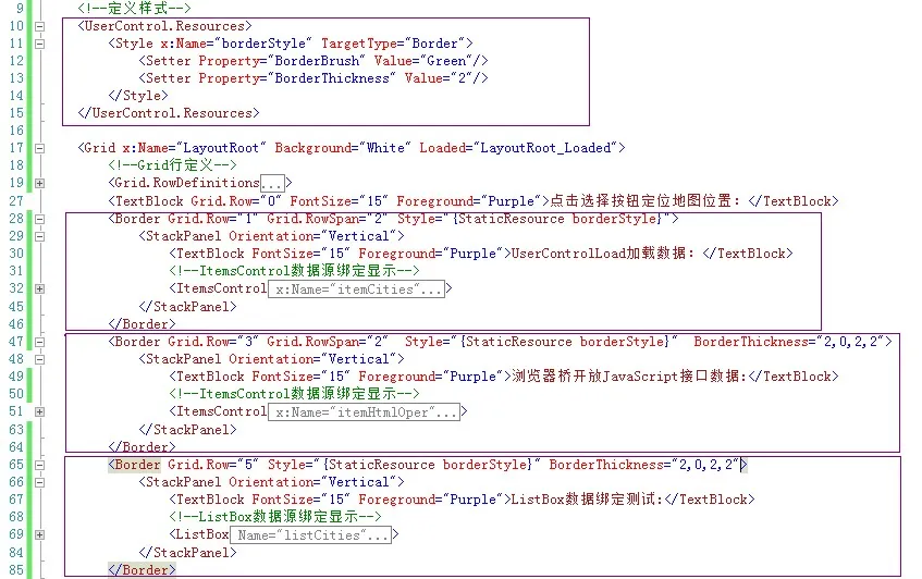 左侧是Silverlight效果,整体使用Grid分配布局,使用三个Border布局进行不同的数据展示,数据采用数据模版绑定,左侧下面是一个按钮操作Div(是用来展示JS操作SL的数据实现动态加载)
